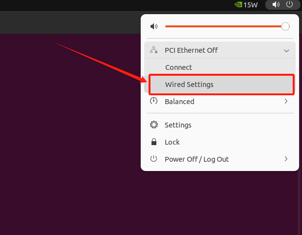 - Click on the top right corner of the desktop Ethernet → select "Wired Settings"