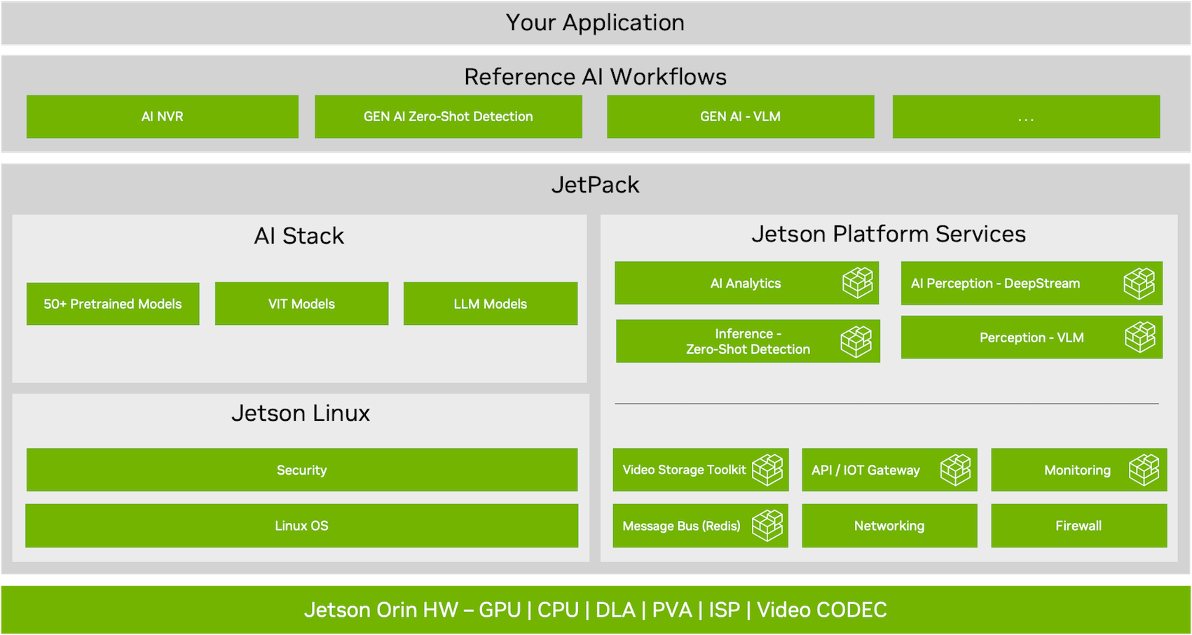 - Pre-install NVIDIA® JetPack 6.0+ SDK, including the complete development environment of CUDA, cuDNN, TensorRT, DeepStream, etc. For system features, see Jetpack SDK 6.0. For system programming tutorials, please refer to the「System Programming Guide」.
