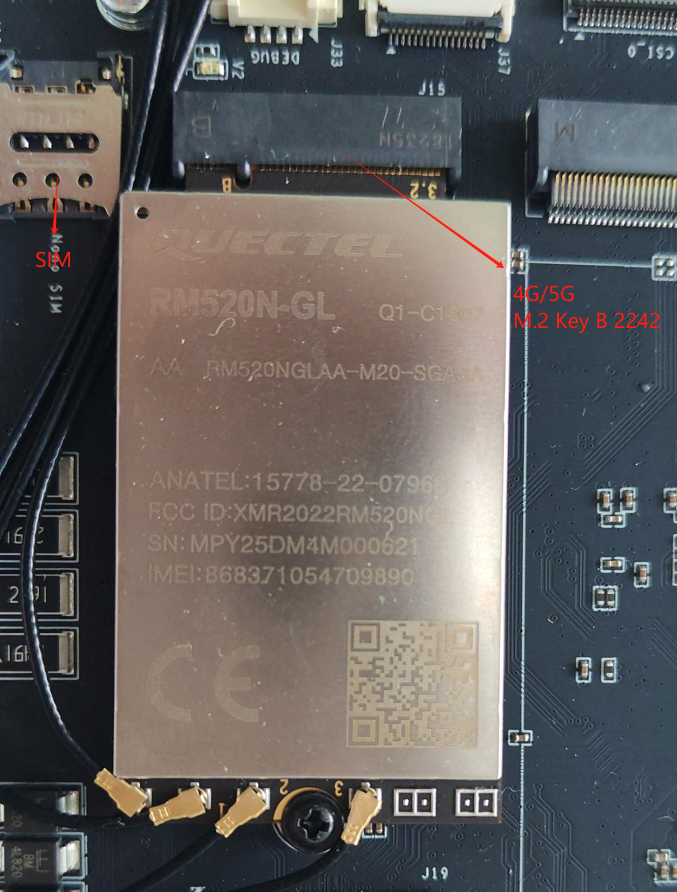 - Mount the 4G/5G module to the M.2 Key B 2242 of J15, insert the SIM card into the SIM card slot of J18, and connect it to the external antenna (Optional);